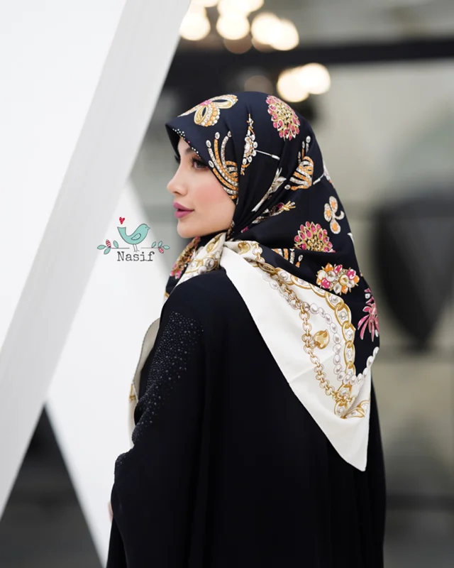 روسري مجلسی ابريشم ژاكارد وارداتي به عرض١٢٠ دور دست دوز با ايستايي و كيفيتي عالي که اصلا ليز نيست