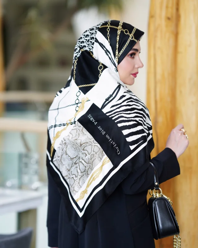 روسري ابريشم ژاكارد با بهترين كيفيت ايستايي خيلي خوب بهترين گزينه براي استايل با چادر عرض ١٣٥ دور دست دوز وارداتي