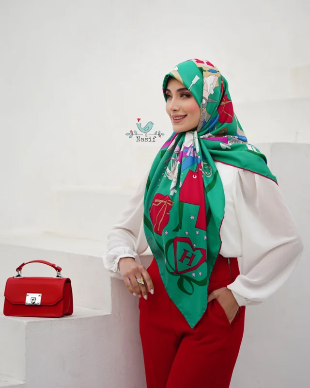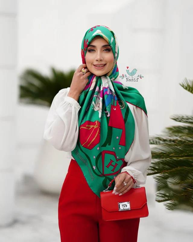 روسري ابريشم توييل كجراه به عرض ١٣٠ ، دور دست دوز با كيفيتي عالي و ايستايي خيلي خوب حتي با چادر ، ارسال رايگان پستي