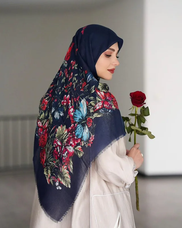 روسري نخ يونيك وارداتي به عرض ١٣٥ خنك و لطيف و كاملا مناسب بهار و تابستان با ايستايي عالي ، مناسب استايل با چادر، بدون چروكي